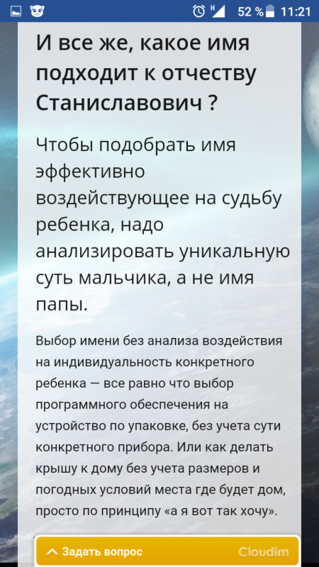 Выбирая имя ребенку , Родители часто допускают одну и ту же ошибку — не учитывают, как отчество повлияет на имя ребенка. В лучшем случае выбирается просто созвучное сочетание имени и отчества, при этом совершенно не учитывается влияние имени Отца, то есть — отчества. Но отчество — это связь ребенка с отцом, основа, на которой будет основано имя ребенка. Влияние отчества проявляется не сразу, а только по прошествии длительного времени, а именно в момент вступления ребенка во взрослую жизнь и начала своего дела.